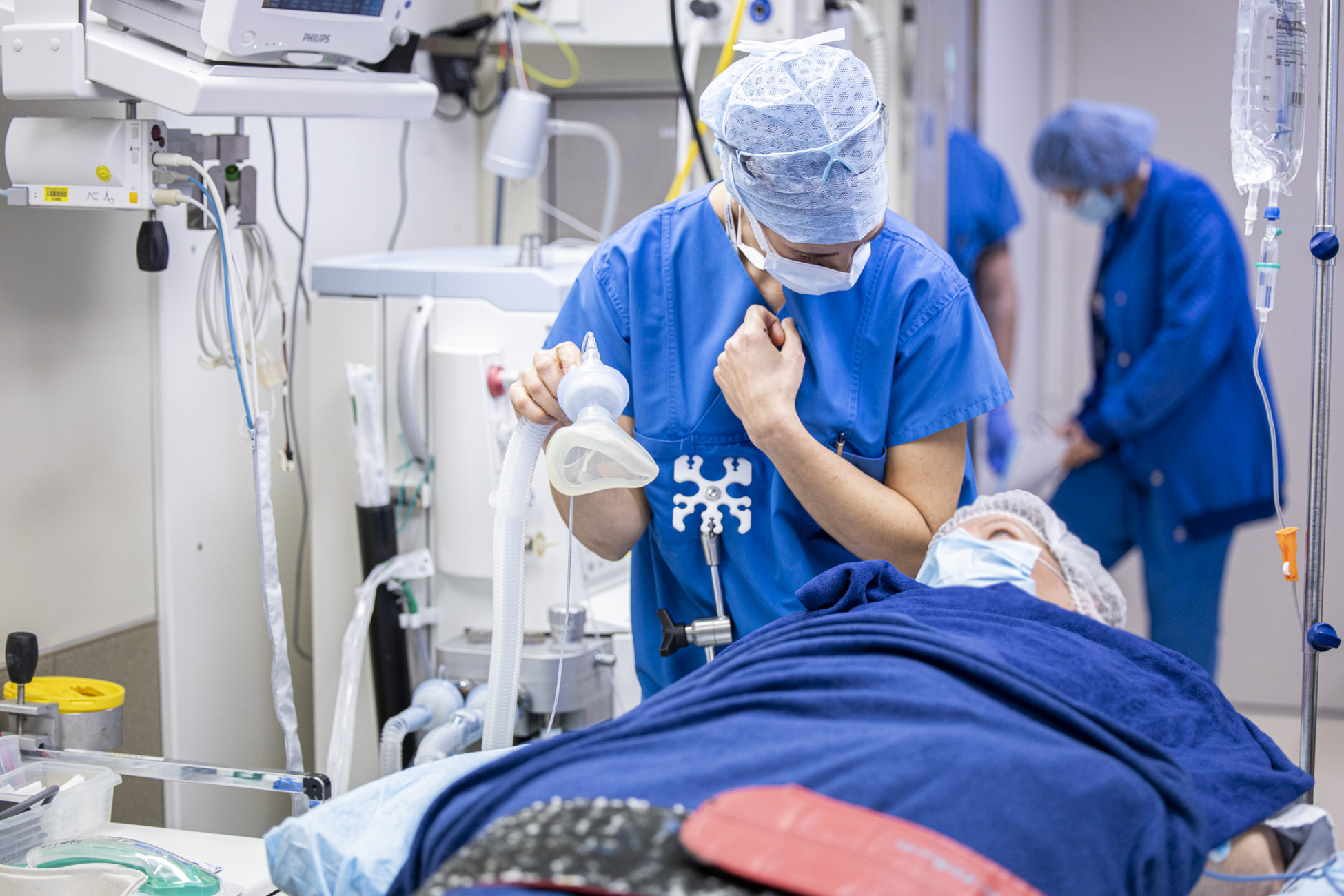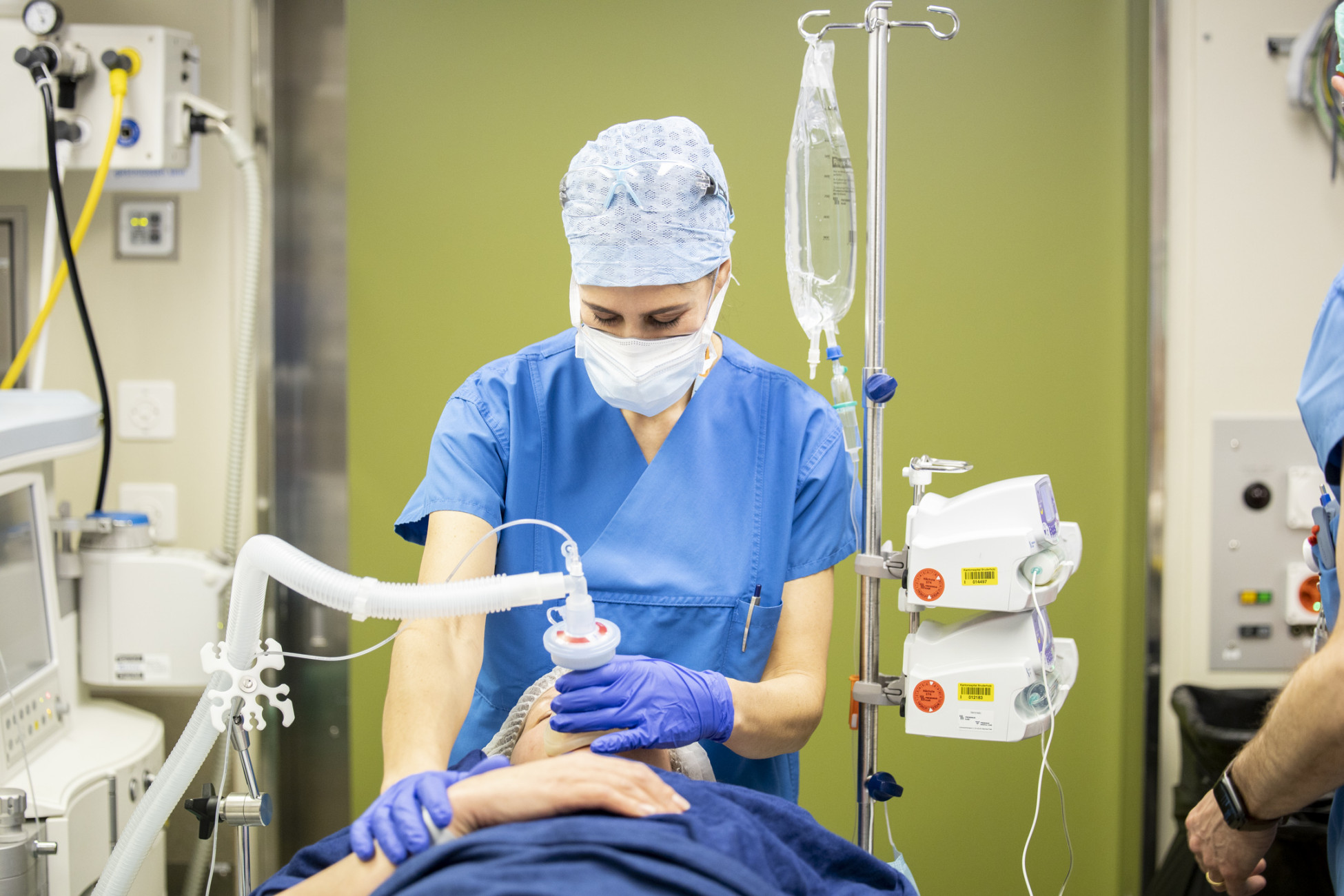 5. Während die Medikamente ihre Wirkung zeigen, unterstütze ich Frau B. in ihrer Atmung. Sobald sie tief in Narkose ist, werden die Atemwege gesichert. Je nach Verfahren kommen ein erweitertes Monitoring, zusätzliche Zugänge und Lagerungsmassnahmen zum Zug. Eine gute Absprache im Team ist hier unerlässlich.