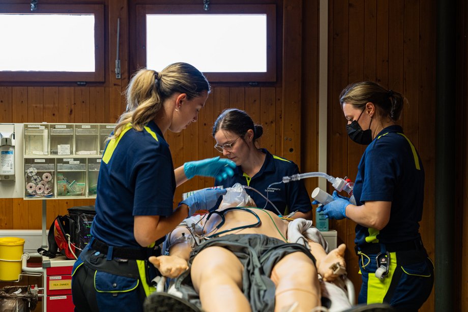 Auch unsere Berufsbildner/-innen brauchen Übung, um unseren Studierenden gezielt und nutzbringend Rückmeldung geben zu können. Deshalb durften sie ein vorbereitetes Simulationsszenario an unserer betriebseigenen Simulationsanlage durchführen. Beispielsweise ein Einsatz wie er jeden Tag vorkommen kann: eine Person wird bewusstlos aufgefunden und muss entsprechend behandelt werden. Um eine möglichst praxisnahe Lernumgebung zu schaffen, haben wir Studierende eingeladen, aktiv an den Szenarien teilzunehmen.