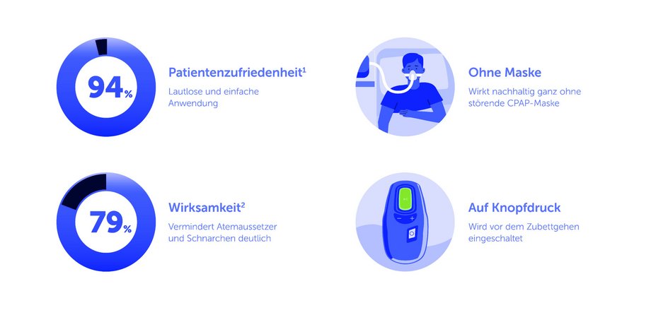 Standardmäßig kommt zunächst die sogenannte CPAP-Maske (CPAP=continuous positive airway pressure) zum Einsatz. Diese unterstützt die Atmung in Form eines Überdrucks, sodass die Atemwege frei und offen bleiben. Doch viele Patienten berichten, dass sie mit der Maske nicht zurechtkommen – sie fühlen sich durch das Gerät unwohl oder klagen über Nebenwirkungen wie Mundtrockenheit, eine gereizte oder verstopfte Nase sowie Druckstellen. Daher brechen etliche Patienten diese Behandlung – trotz aller Bemühungen – irgendwann ab. Inzwischen gibt es aber für leichtere Formen der OSA alternative Verfahren wie die Unterkieferprotrusionsschiene und bei mittel- bis schwergradiger Form die Inspire Therapie.