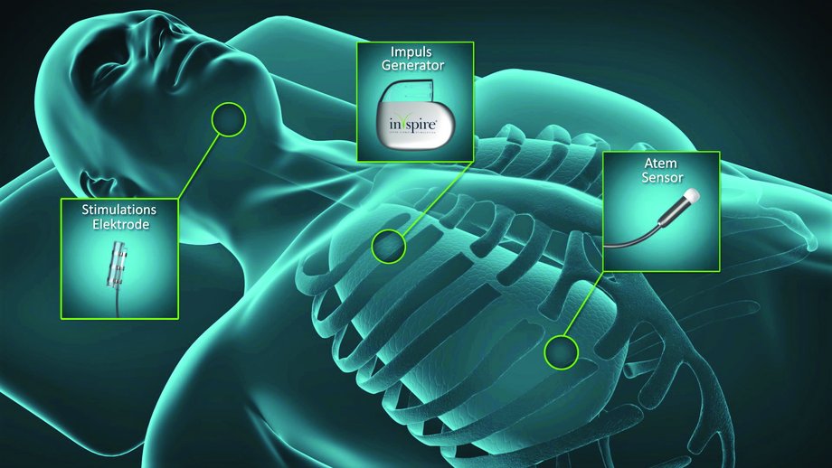 Inspire wird im Rahmen eines etwa zweistündigen Eingriffs unter die Haut eingesetzt und besteht aus drei Komponenten. Eine Elektrode, die an den Zungennerv gelegt wird, bewegt die Zunge nach vorne, um die Atemwege offen zu halten. Der Schrittmacher wird, ähnlich eines Herzschrittmachers, unter dem Schlüsselbein platziert. Die dritte Komponente ist der Atemsensor, der die atemsynchrone Stimulation der Zunge sicherstellt.